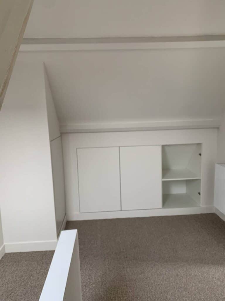 Ruime overloop met opstelling van c.v.-ketel en opbergruimte. Twee slaapkamers en tweede badkamer met toilet, douche en wastafel.
