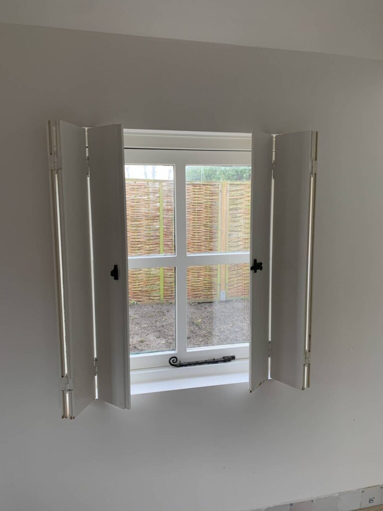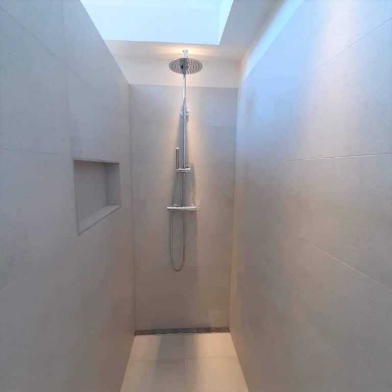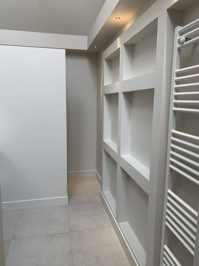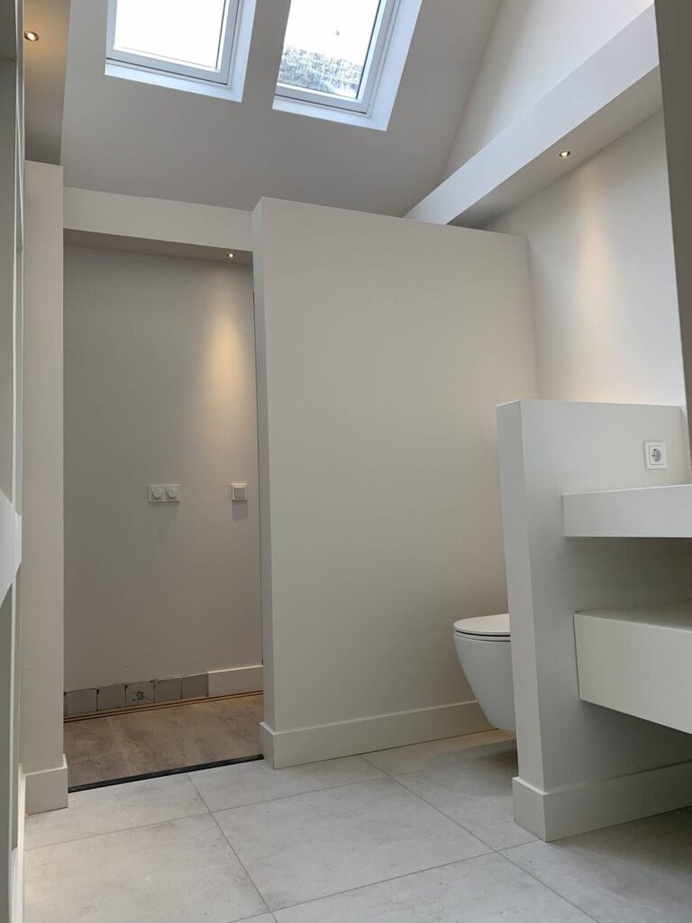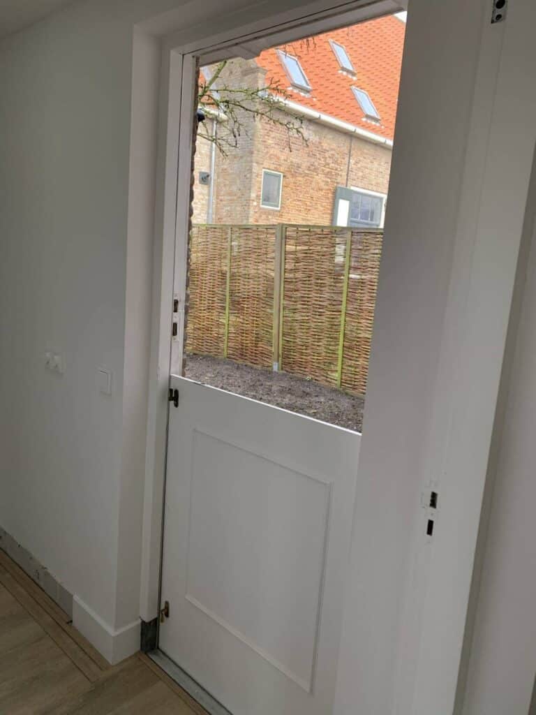 Middels een tussenhal, met toegang tot een 2e achtertuin/patio, bereikt u de (nieuwe) badkamer met toilet, dubbel wastafelmeubel en inloopdouche. Slaapkamer met originele (sier)bakoven.