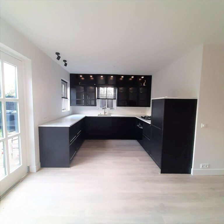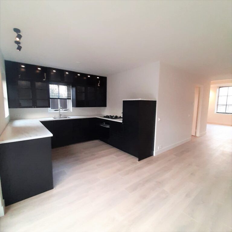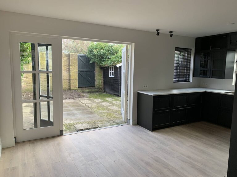 Ruime en lichte woonkamer met schouw, veel lichtinval, trapopgang naar de 1e verdieping en openslaande deuren naar de zonnig gelegen achtertuin. De (nieuwe) open keuken aan de achterzijde is voorzien van een wit blad, (veel) opbergruimte en apparatuur zoals vaatwasser, 5-pits kookplaat, koelkast en combi magnetron/oven.