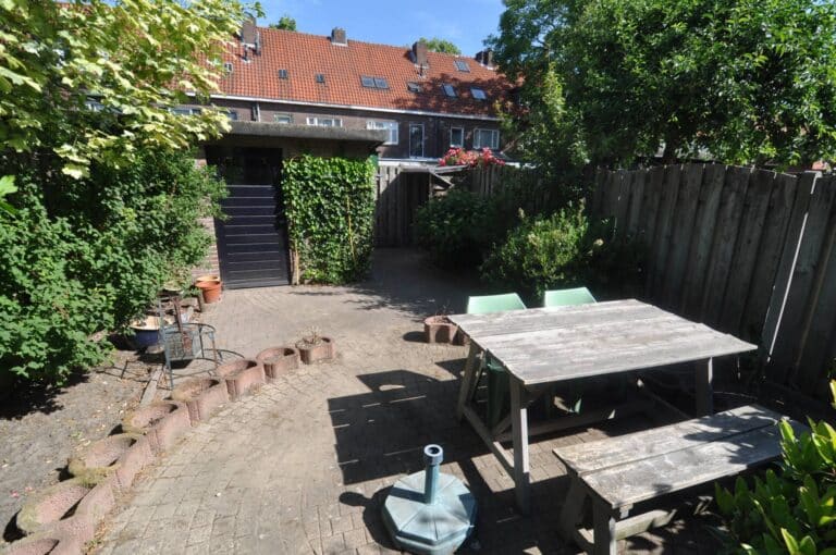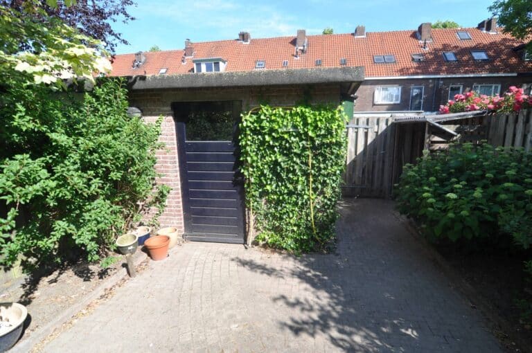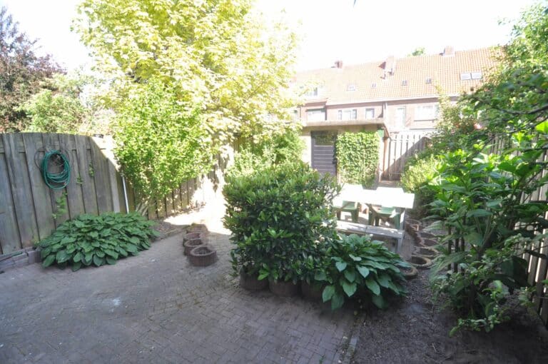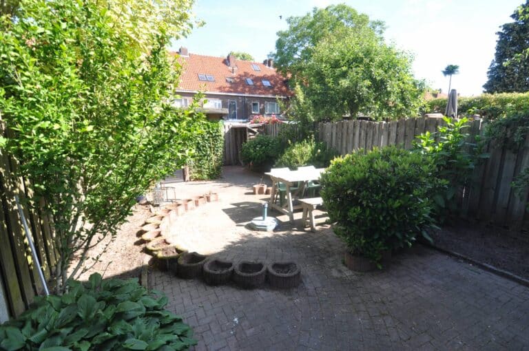 Fijne achtertuin welke voorzien is van een berging en achterom.
