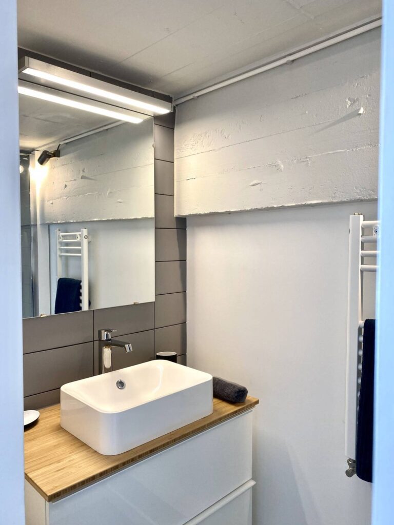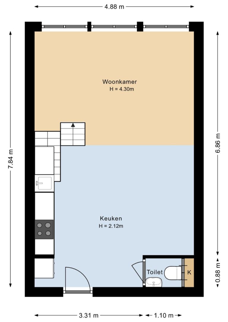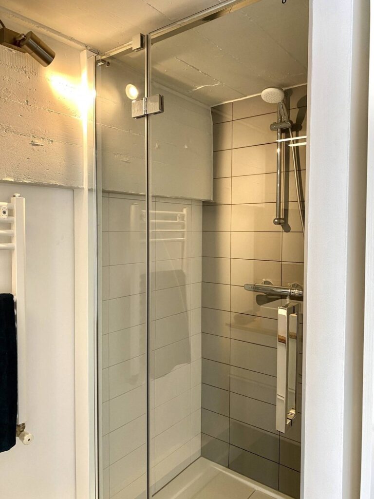 Entree appartement. Eerste toilet. Open keuken, met koelkast, vriezer, combi magnetron, inductie kookplaat, vaatwasser en afzuigkap. De woonkamer heeft 2 niveaus. Het lagere niveau grenst aan de keuken en vormt samen een woonkeuken. Het hogere deel is voor het zitgedeelte waardoor u fraai uitzicht heeft door de hoge raampartijen. Onder het verhoogde zit gedeelte zitten een paar verrassende opberg ruimte, waaronder een uitschuifbare lade waar zomaar een 0,5 m3 aan schoenen in past! Via een trap in de woonkamer de slaapkamer op de entresol, Een fraaie aangrenzende badkamer met wastafel en inloopdouche.
