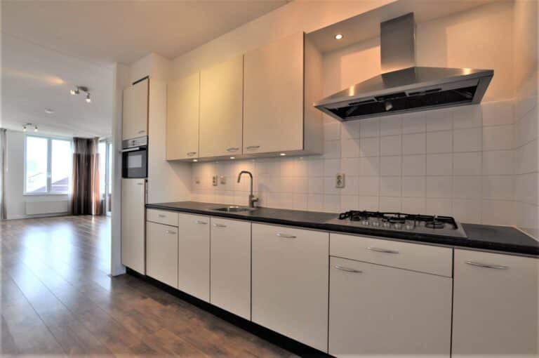 De riante woonkamer beschikt over twee delen; een leef- en apart eetgedeelte. Tussen beide treft u de moderne keuken met diverse inbouwapparatuur waaronder een vaatwasser, koelkast, oven en 4-pits gasfornuis met afzuigkap.