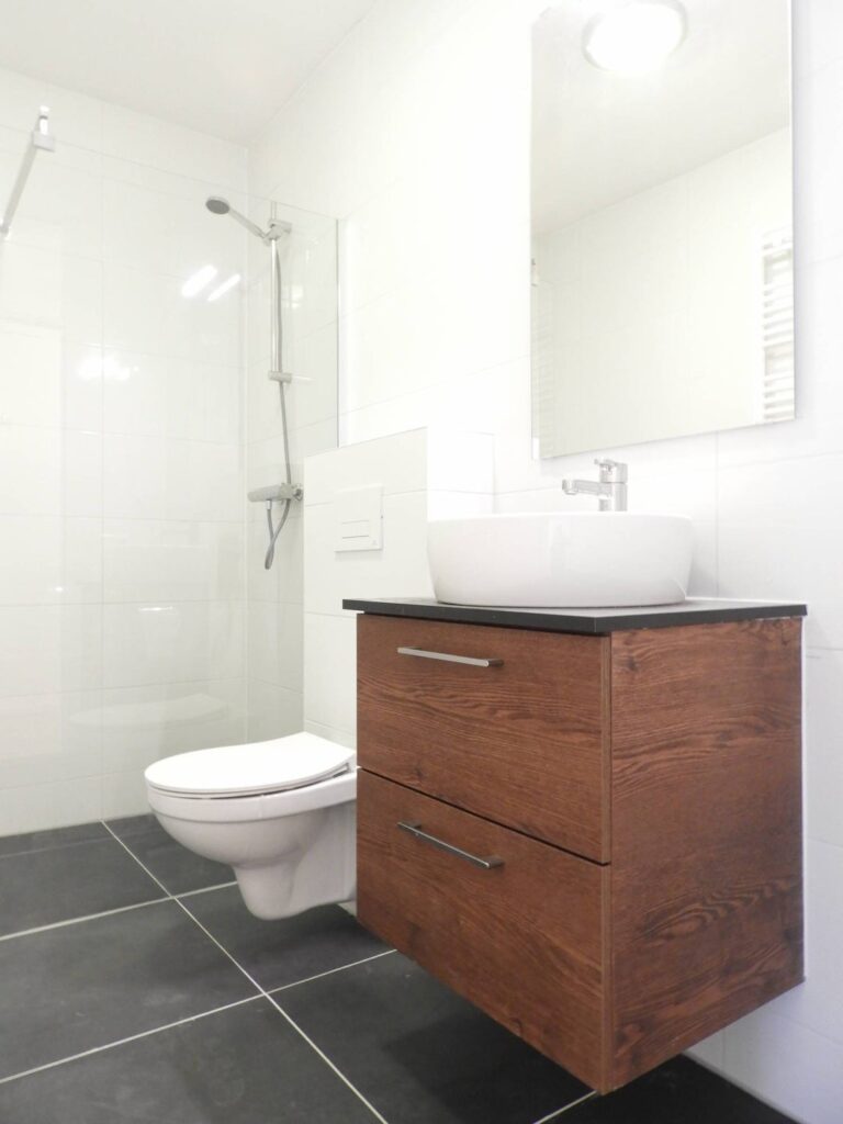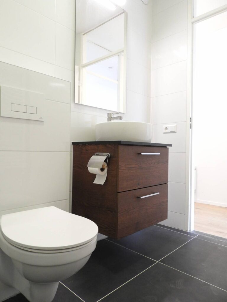 Ook de badkamer is, net als de keuken, nieuw geplaatst in 2021 en beschikt over een inloopdouche, wastafel, toilet en handdoekenradiator. Het betreft een stijlvolle badkamer in lijn met de moderne uitstraling van de keuken.