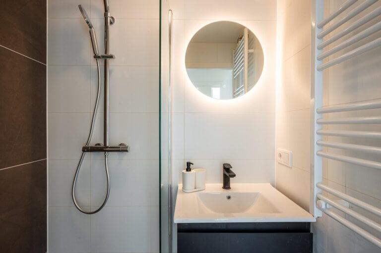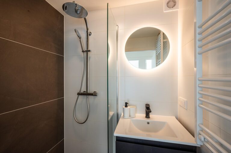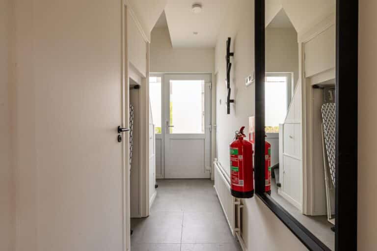 Overloop met toegang tot drie slaapkamers, de badkamer en de wasruimte met wasmachine en droger. De moderne badkamer beschikt over een inloopdouche en wastafelmeubel. De woning is voorzien van rolluiken, waardoor er optimale zon- en privacyregeling is.