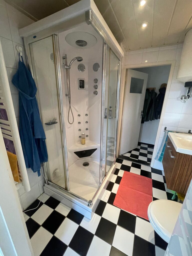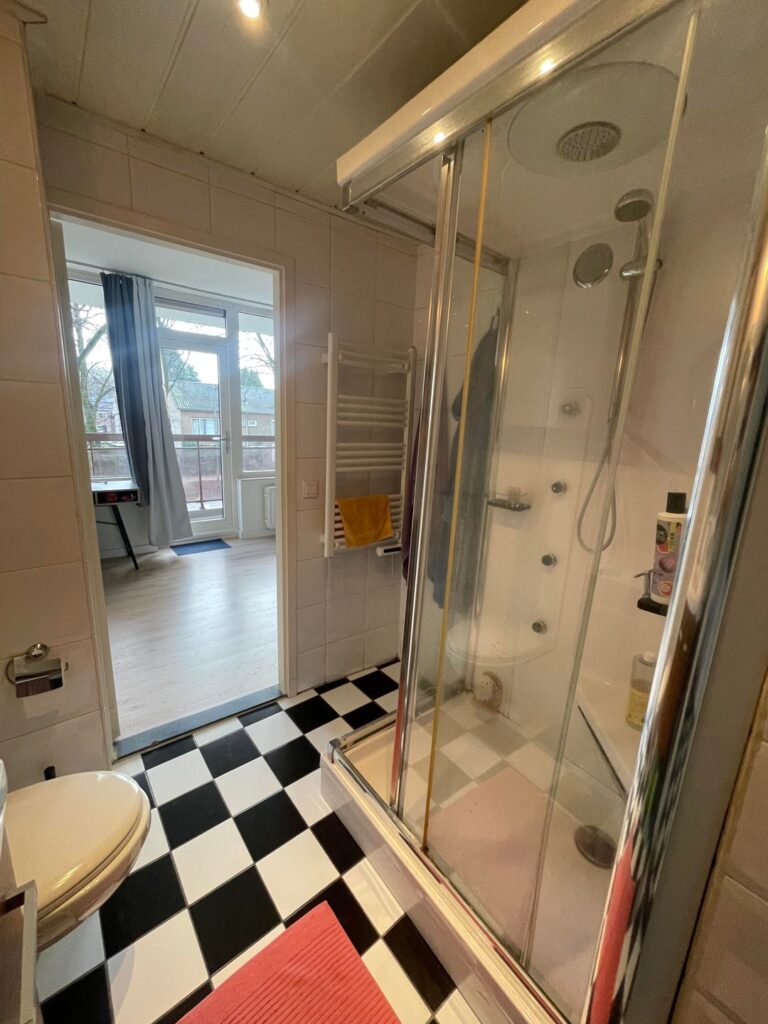 De luxe badkamer is vanuit zowel de hal als de slaapkamer bereikbaar en beschikt over een massagestraal-douche, wastafelmeubel en toilet.