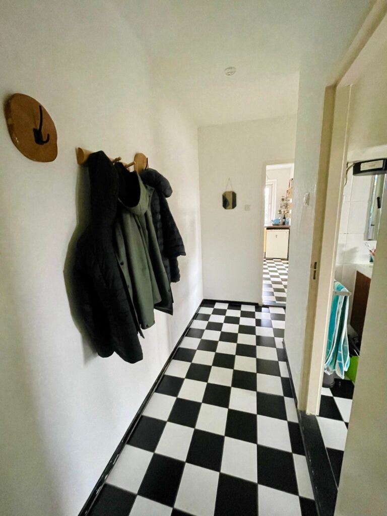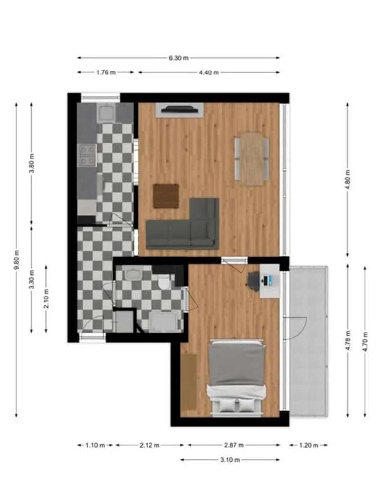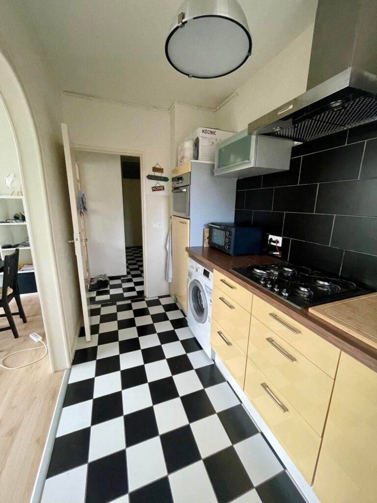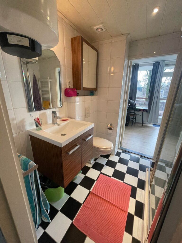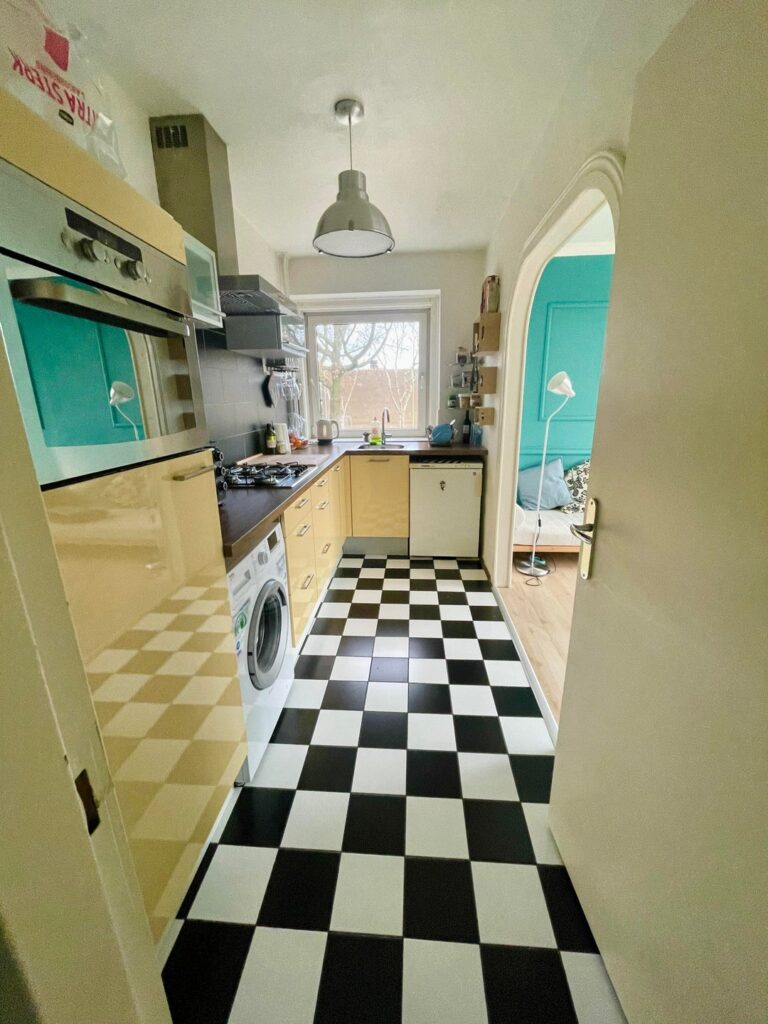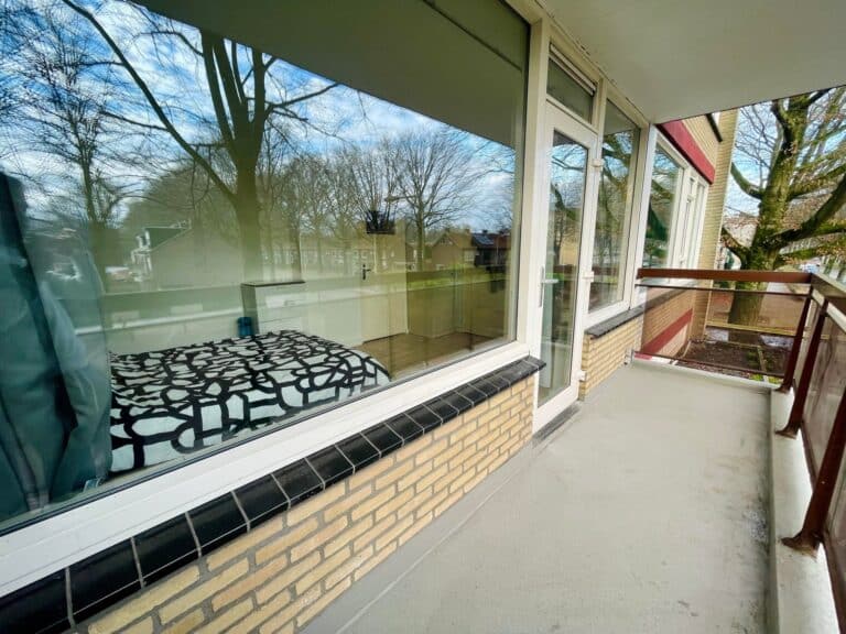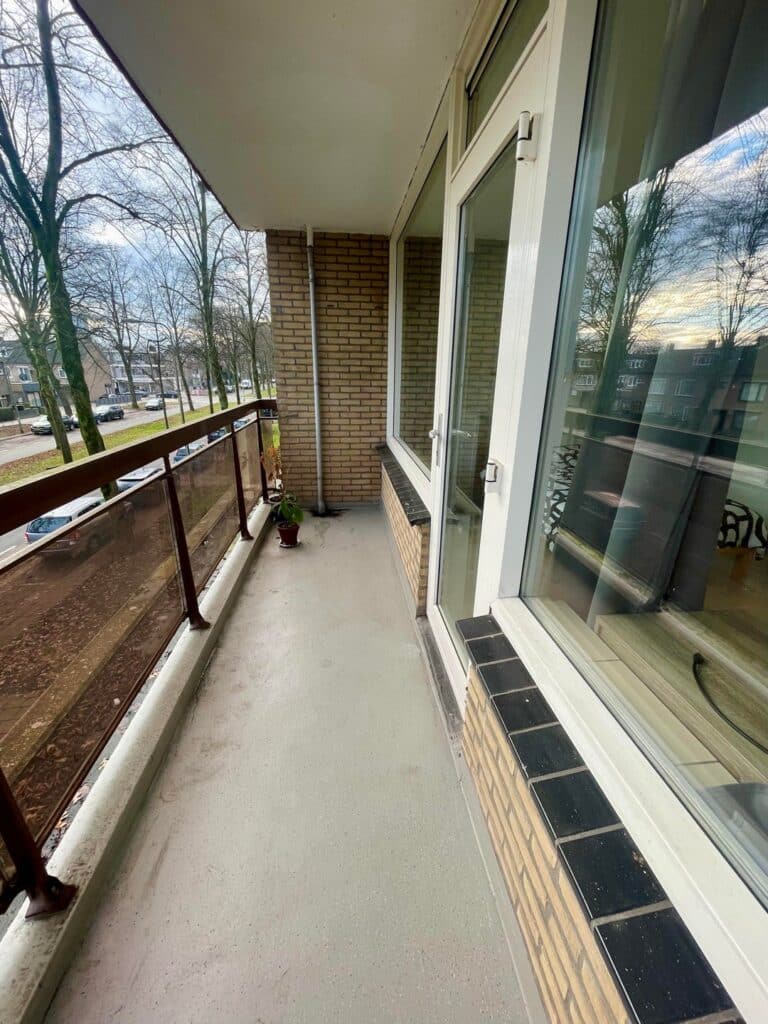 Via de hal bereik je de moderne keuken, voorzien van een ruime koelkast, gaskookplaat en afzuigkap. Vanuit de keuken stap je de lichte woonkamer binnen, die toegang geeft tot de slaapkamer. De slaapkamer biedt toegang tot het balkon (4,7 x 1,3 meter).