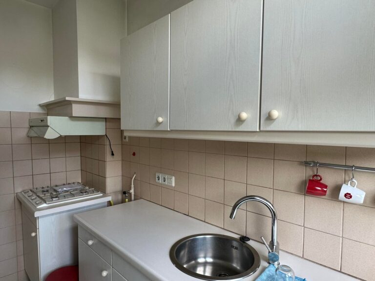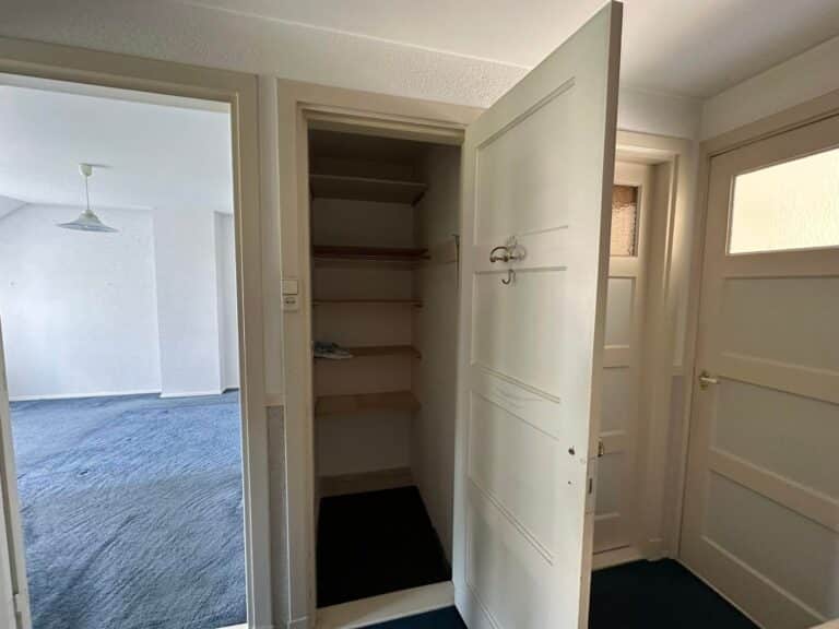 - Overloop, toegang tot de woonkamer, keuken, toilet, trapopgang naar tweede etage. Vanuit de keuken en woonkamer is toegang tot het balkon aan de achterzijde.