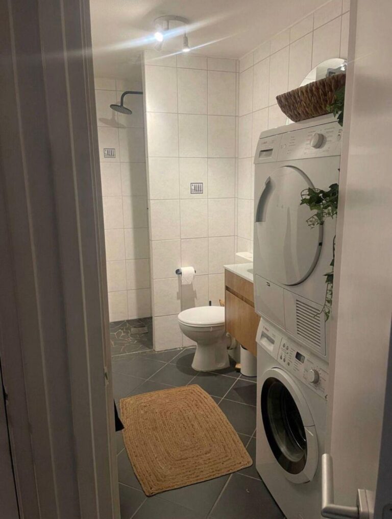 Via de entree met veel bergruimte kom je in de hal. Aan de hal grenzen de ruime slaapkamer en de moderne badkamer, voorzien van een inloopdouche, wastafelmeubel, toilet, handdoekradiator en een wasmachine met droger.