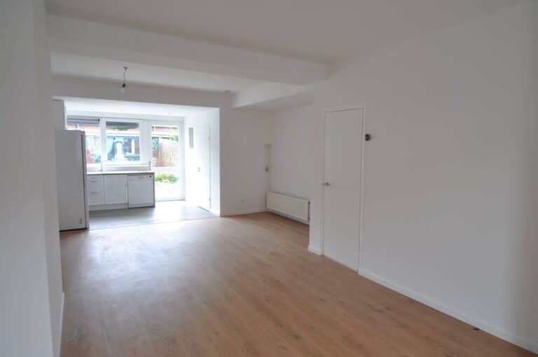 De woonkamer is van een ruim formaat en is volledig voorzien van een nieuwe laminaatvloer. Door een gerealiseerde uitbouw is er een grote ruimte ontstaan met een zithoek, eethoek en open keuken. Naastgelegen tot de woonkamer is een volledig nieuwe badkamer gecreรซerd met douche, toilet en wastafel met ombouw.