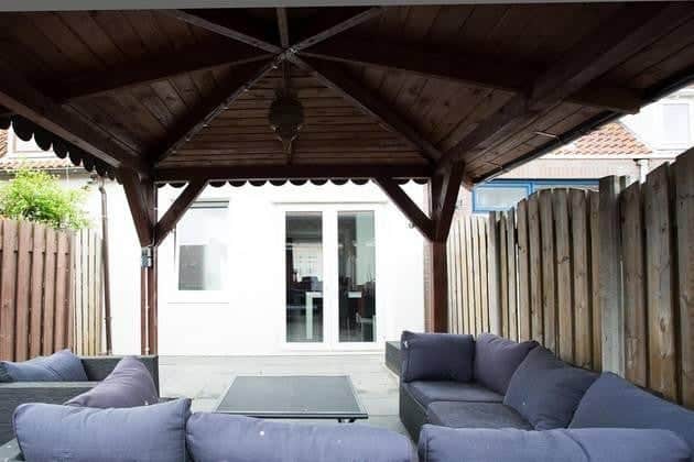 Bestrate achtertuin gelegen op het westen. De achtertuin is voorzien van sierbestrating, overkapping en achterom. Achterin is een stenen berging met elektra aanwezig ( ca. 6m²).