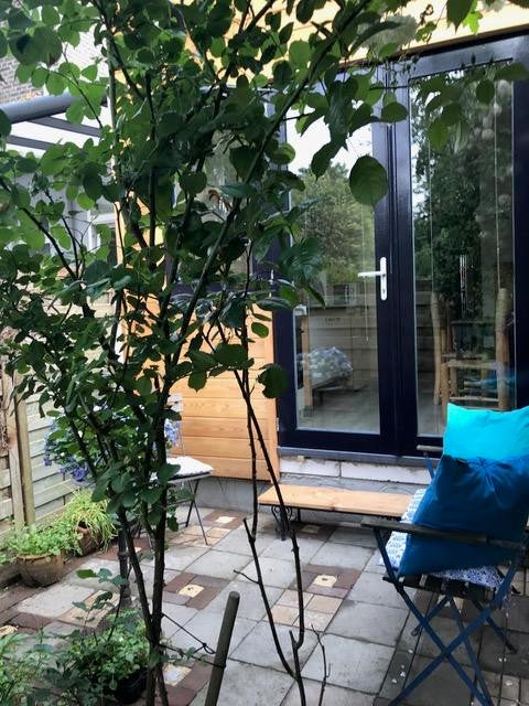 Het terras van 4 x 2,5 mtr. geeft uitzicht op de rustige tuin.