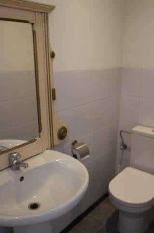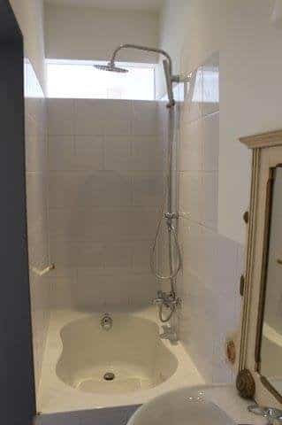 De badkamer van 3 x 1.15 mtr. is voorzien van een toilet, wastafel en bad met regendouche.