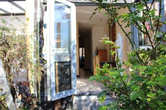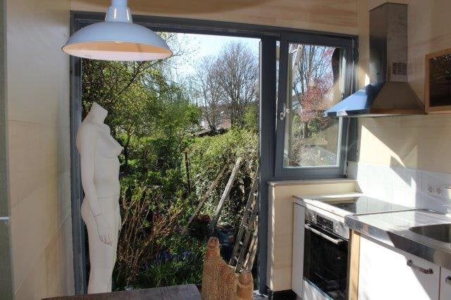 De keuken die grenst aan de tuin met grote openslaande deuren is 4 x 2.45 mtr en is voorzien van een ijskast met diepvriesvak, inductie kookplaat, oven en afzuigkap.