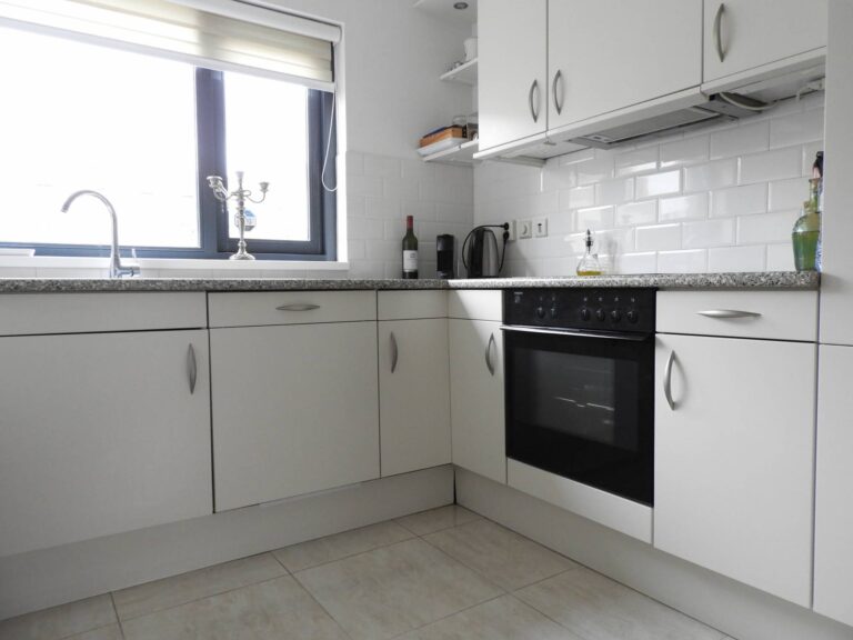 De keuken is te vinden aan de voorzijde van de woning. De ruime L-vormige keuken is voorzien van alle gemakken, te denken aan een vaatwasser, gaskookplaat, afzuigkap, koelkast en meer dan voldoende kastruimte. Goed om te benomen is de enorme bergruimte naast de keuken waar u meer dan voldoende ruimte heeft voor het plaatsen van een extra vriezer en eventuele opslag. Vanuit de raampartij aan de voorzijde van de woning heeft u zich op de straat.