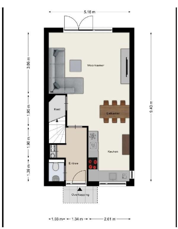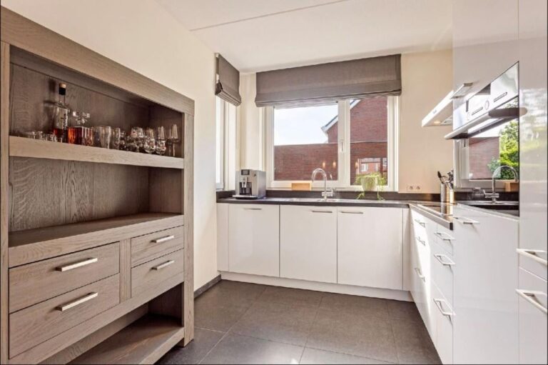 Hal voorzien van gastentoilet met fonteintje. De ruime, lichte woonkamer biedt voldoende plek voor een grote zithoek en eettafel. Aan de voorzijde bevindt zich de stijlvolle open keuken in hoekopstelling, volledig uitgerust met: