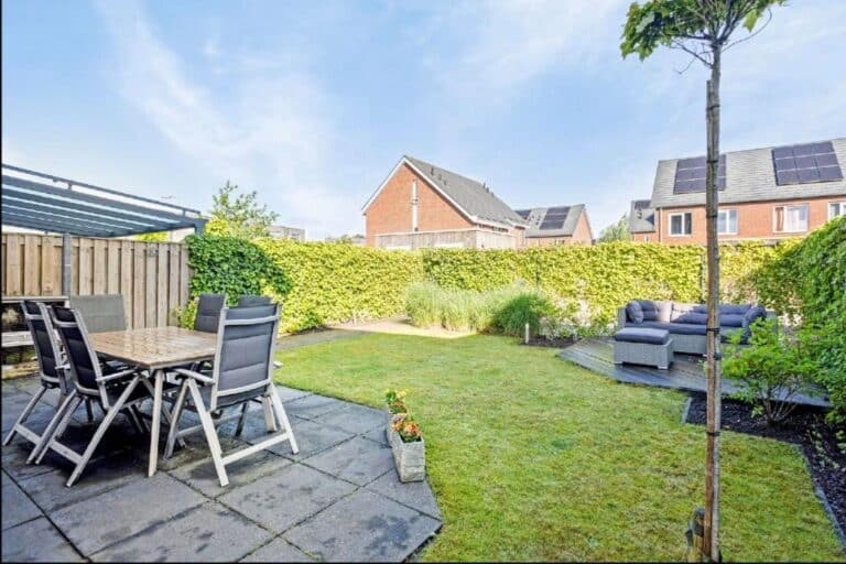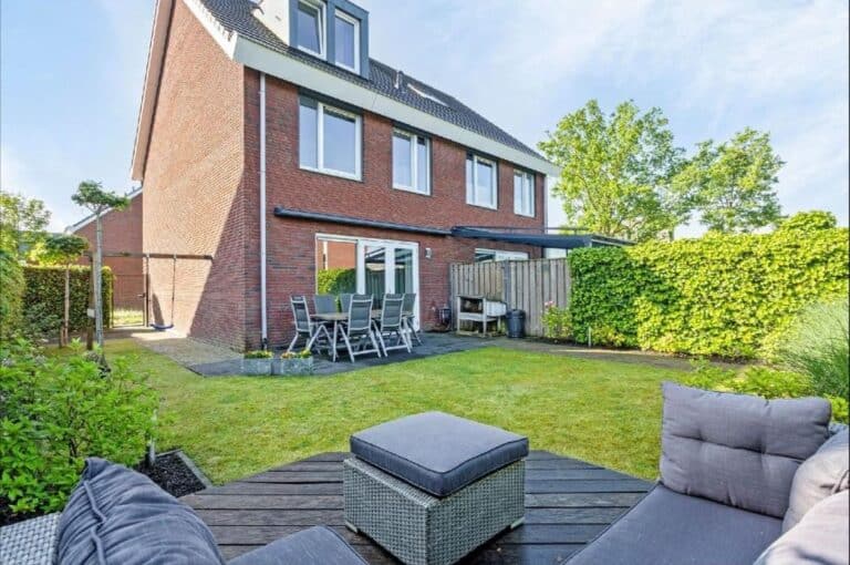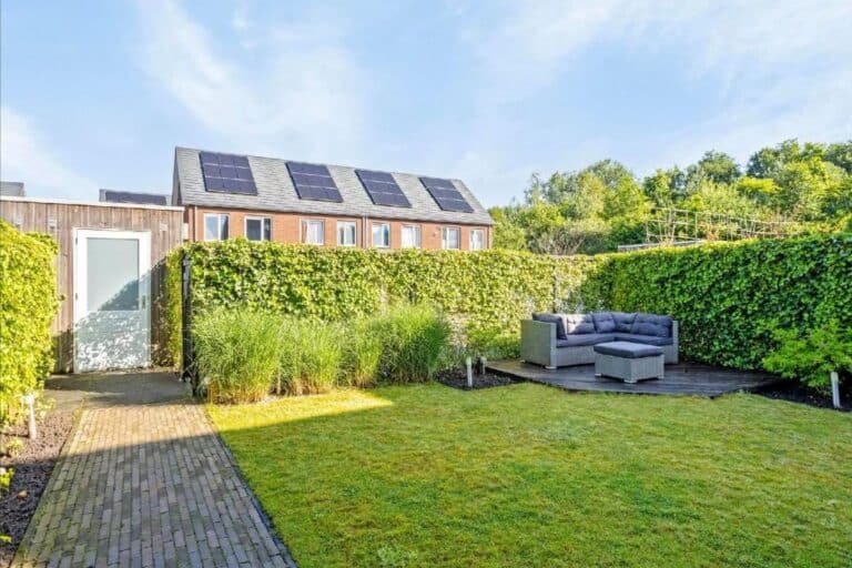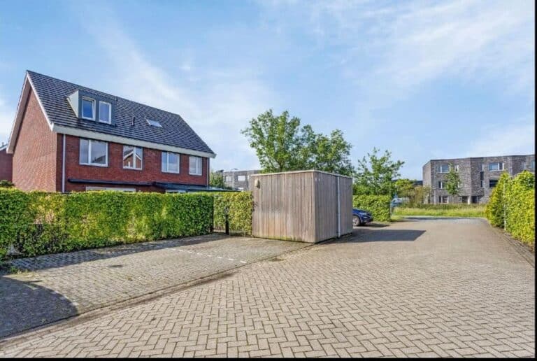De tuin is ruim van formaat en beschikt over een grote berging, perfect voor fietsen of tuinspullen. Aan de achterzijde van het perceel liggen twee privรฉparkeerplaatsen voorzien van een laadpaal voor elektrische voertuigen.