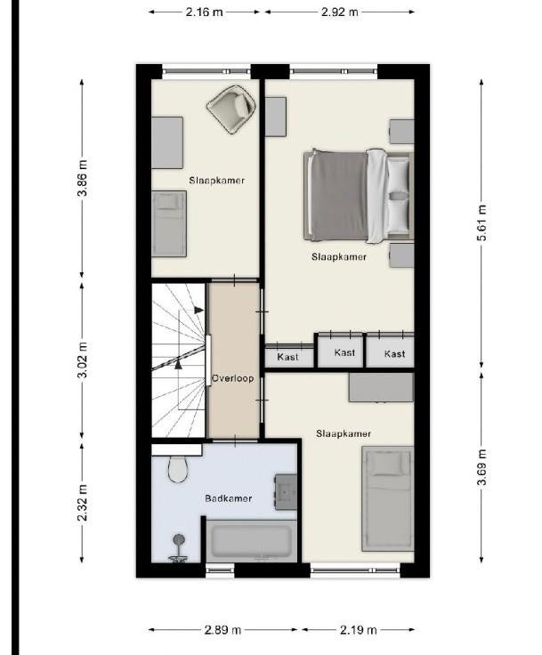 Op deze verdieping bevinden zich drie slaapkamers, ideaal voor kinderen, werk- of logeerkamers. De slaapkamers hebben allemaal een goede afmeting en de ouderslaapkamer is voorzien van praktische kastruimte. De badkamer is compleet ingericht met een ligbad, douche, wastafel en 2e toilet.