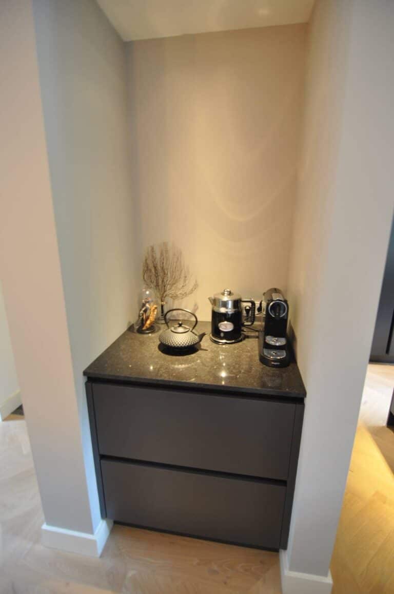 De keuken heeft een wandopstelling met daarin de koel/vriescombinatie, combi-oven en diverse kasten. In het kookeiland bevindt zich daarnaast nog de spoelbak met mengkraan en een vaatwasser. Ook is het eiland voorzien van een 5-pits gaskookplaat, waardoor je tijdens het koken in contact staat met eventuele gasten. Verder zijn er in het eiland zijn nog diverse kasten beschikbaar. Leuk detail: de keuken beschikt tevens over een zogenaamde ‘koffiecorner’ wat het meteen gezellig maakt.