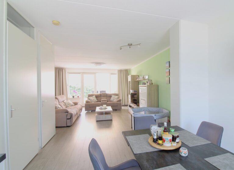 Entree naar de hal welke toegang geeft tot een ruime woonkamer met open keuken. De volledige beneden verdieping is voorzien van een nette laminaatvloer.