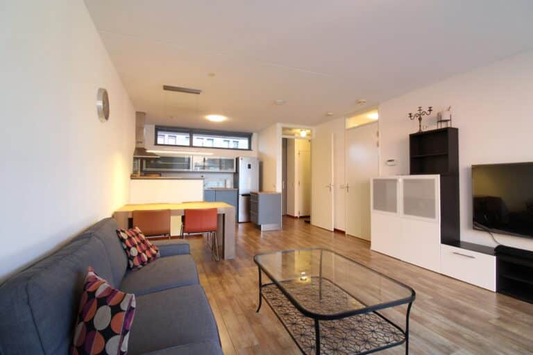 Ruime woonkamer voorzien van een robuuste eettafel met design eettafellamp, sfeervolle zithoek met nieuwe smart TV (65 inch), Philips soundbar (wireless) en luxe semi-open keuken. De keuken is voorzien van alle gewenste apparatuur zoals een Amerikaanse koelkast met diepvries, 4-pits inductiekookplaat (nieuw van Bosch), combi-magnetron (nieuw van Miele), vaatwasser en afzuigkap. Vanuit de woonkamer eveneens toegang tot het balkon gelegen aan de voorzijde.