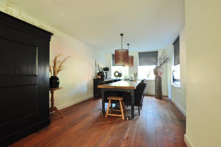Royale doorzon woonkamer in L-vorm beschikkende over een karakteristieke houten vloer en raamdecoratie. Tevens is er een behendige bergkast gesitueerd onder de trap. Ook kunt u de achtergelegen keuken en tuin bereiken vanuit de woonkamer.