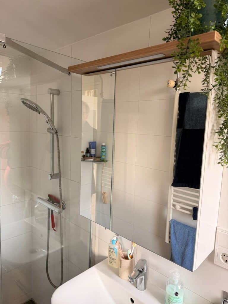 - Moderne badkamer met inloopdouche, wastafelmeubel en wasmachineaansluiting.