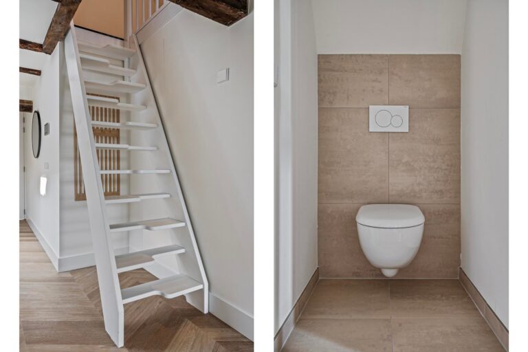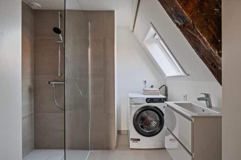 De woning beschikt over een apart toilet met een vrijhangend design. De badkamer is modern en praktisch ingericht en voorzien van een ruime inloopdouche, een handdoekradiator, een wastafel met spiegel en een was-/droogmachine, zodat u direct beschikt over alle benodigde voorzieningen.