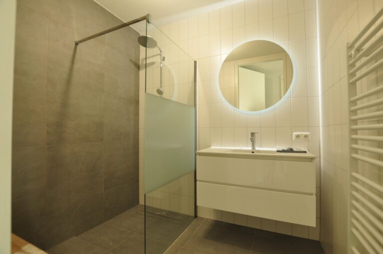 Moderne badkamer voorzien van een ruime inloopdouche en wastafel met meubel. Ook treft u hier de aansluiting voor de wasmachine.