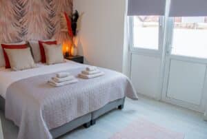 Begane grond: Entree/hal met vaste trap naar de eerste verdieping. Ruime woonkamer met zit- en eetgedeelte. Luxe open hoekkeuken voorzien van inbouwapparatuur. Twee slaapkamers met luxe box spring bedden waarvan 1 slaapkamer toegang heeft tot het balkon. Badkamer met inloopdouche en wastafel en toilet. Over de gehele breedte is er aan de achterzijde een balkon aanwezig. Berging met wasmachine en droger.