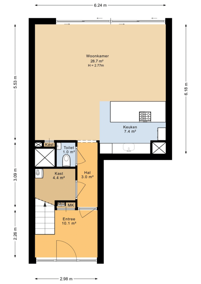 Royale entree met garderobe. Toilet met fonteintje. Grote woonkamer met open keuken. De keuken is voorzien van vaatwasser, combi magnetron, koelkast en vriezer. Ruime achtertuin met fietsenberging en achterom naar openbare speel gelegenheid.
