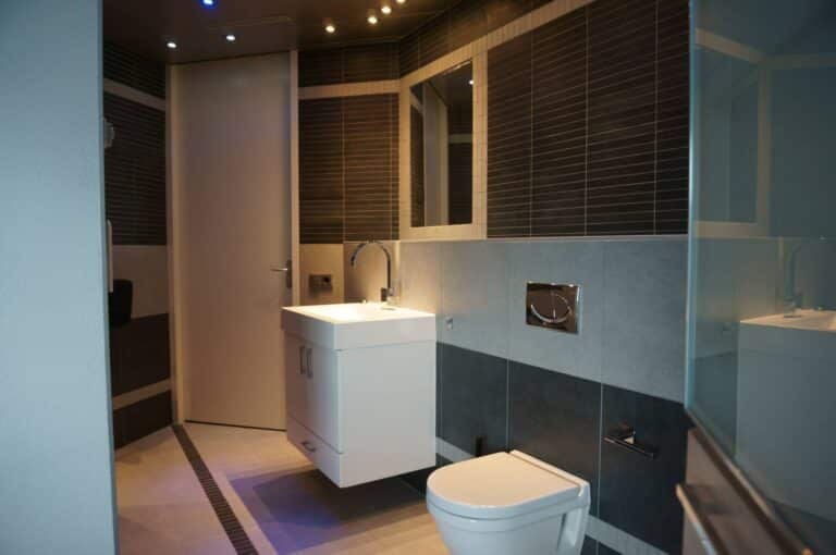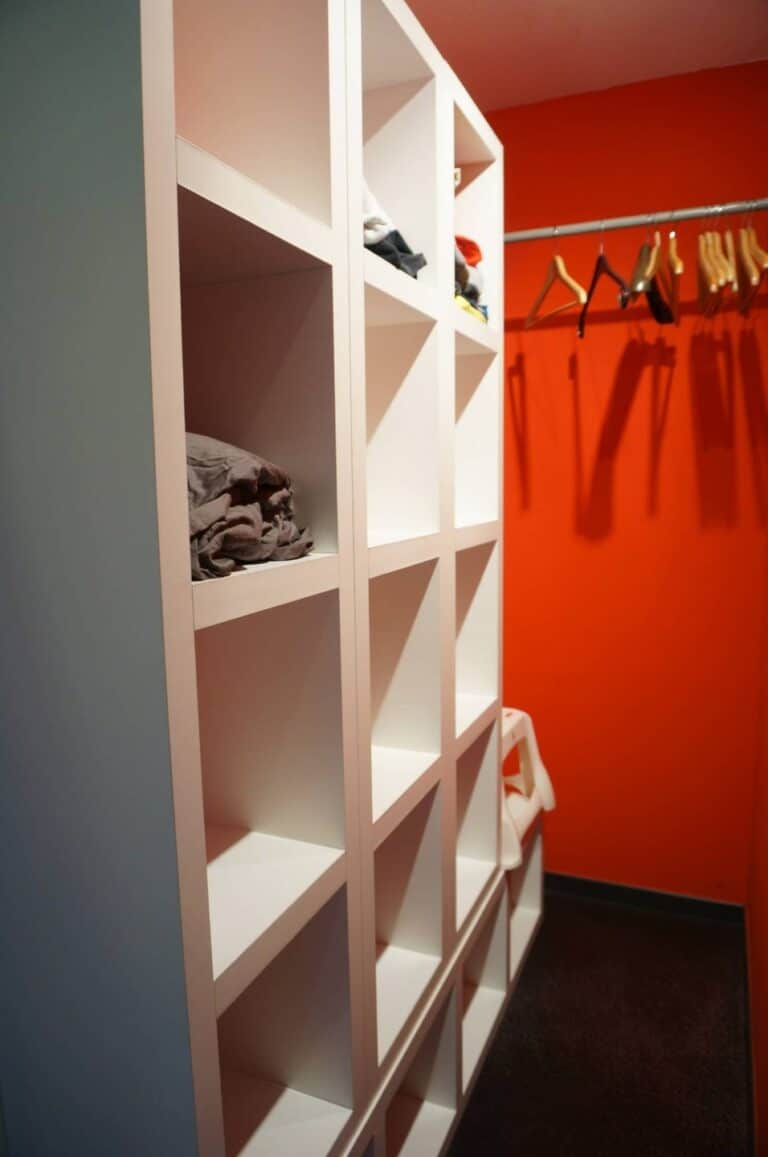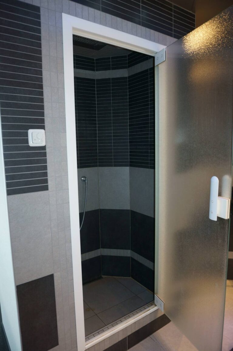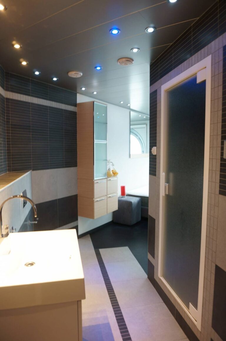 Trap naar 1ste etage. Ruime masterbedroom met open badkamer. Deze is voorzien van wastafel en stoomdouche. 2de slaapkamer en aparte inloopkast.