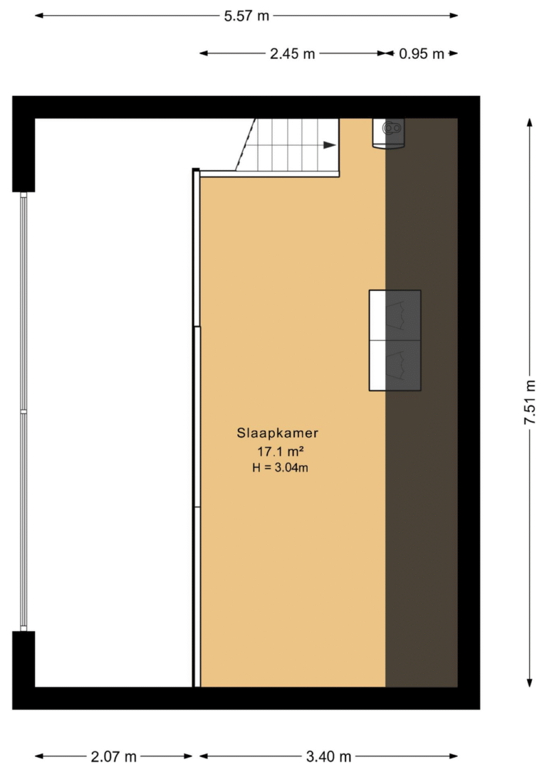 De open eerste verdieping biedt ruimte voor een tweepersoonsbed, kastruimte en de aansluiting voor wasmachine en droger. Vanuit hier houdt u uitzicht op de Turfsingel. Let wel: door de authentieke balkenconstructie vraagt de indeling om enig praktisch inzicht.