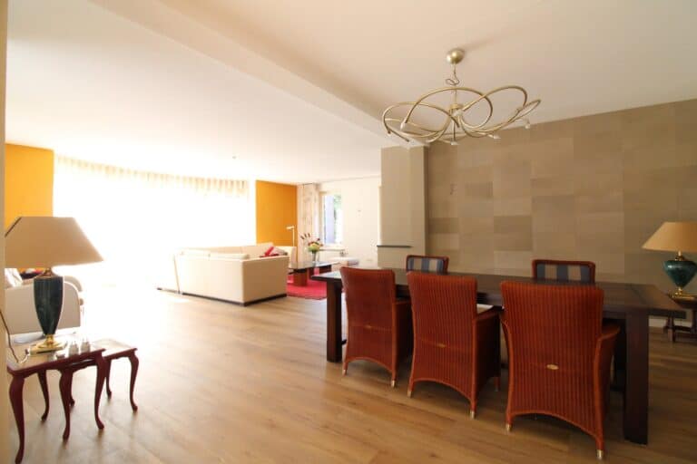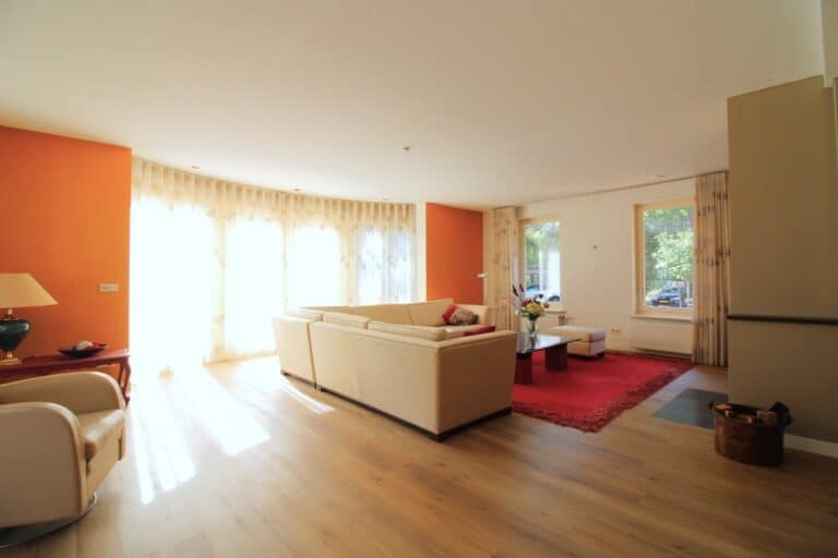 Royale woonkamer in Z-vorm en omring door beraming voor veel natuurlijke lichtinvalt. Er zijn diverse mogelijkheden om zit- of eethoeken te creëren, en ook hebt u toegang tot de keuken vanuit de woonkamer.