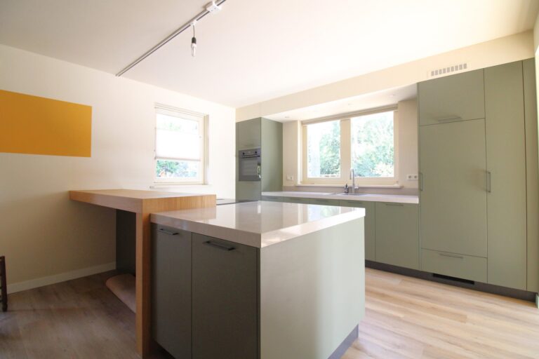 Deze keuken is modern ingericht, en beschikt over diverse inbouwapparatuur, waaronder een koelkast, kookeiland met 4-pits inductiekookplaat met geintegreerd afzuigsysteem, een vaatwasser, oven en een quooker kraan. Vanuit de keuken hebt u een uitzicht over de achtertuin.