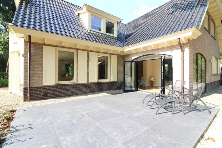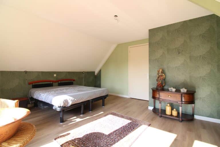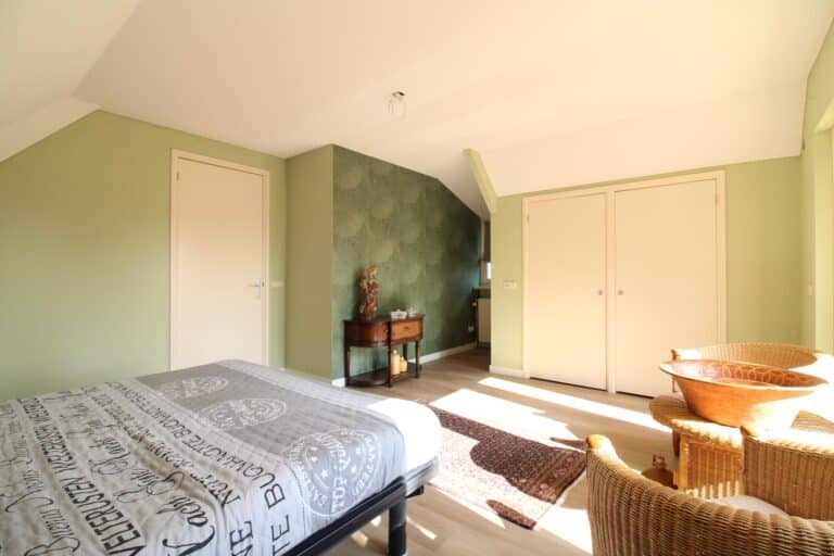 De ouderslaapkamer strekt over de breedte van de woning en is eventueel af te sluiten. Deze kamer heeft een en-suite badkamer met daar een inloopdouche, dubbele wastafel met ombouw en een toilet. Vanuit de slaapkamer zelf kijkt u rustgevend weg over de omringende tuin.