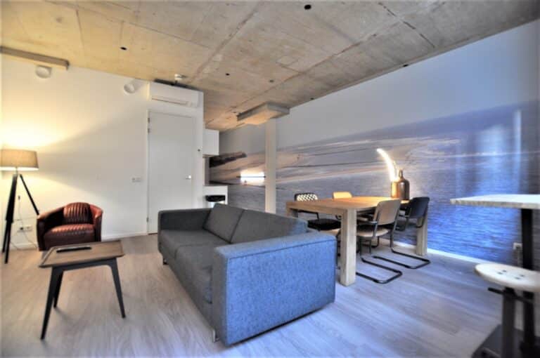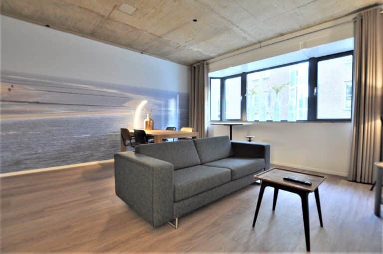 BG tot en met 4e etage; 2- en 3-kamer appartementen variërend in oppervlaktes van 50 tot 99m2. Alle appartementen zijn voorzien van eigen intercom en met smaak en luxe ingericht v.v. kwalitatieve vloeren, airconditioning, design keuken v.v. vaatwasser, koel/vrieskast en inductie-kookplaat. De slaapkamers zijn voorzien van een tweetal boxspring bedden (afmeting 200 bij 90 cm) welke voldoen aan hoge eisen. Alle slaapkamers zijn tevens v.v. flatscreen smart tv's. De badkamers zijn uitgevoerd met bad of douche, wastafel en toilet, gedeeltelijk betegeld. Een inpandige berging is v.v. een wasmachine/droger combinatie. De woonkamer is modern en ook weer smaakvol ingericht. Een ruim bemeten zithoek met flatscreen tv, aparte eethoek en losse verlichting.
