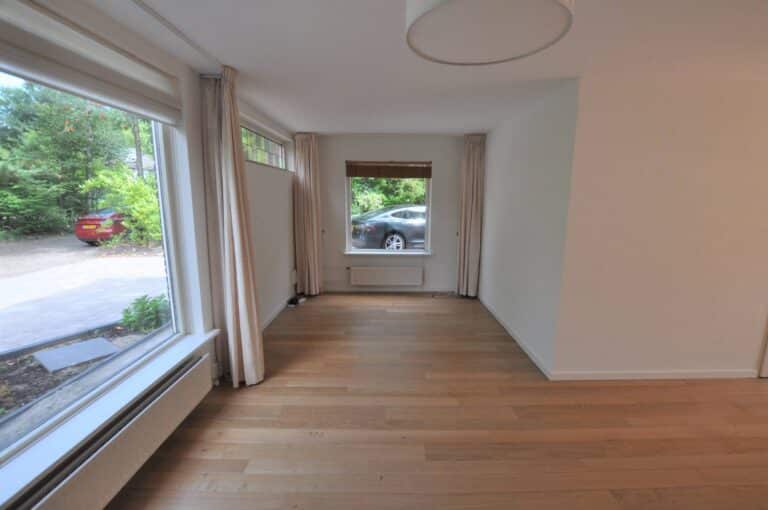 De woonkamer is opvallend ruim en licht dankzij de uitbouw aan de achterzijde, die is voorzien van een grote lichtkoepel. De schuifpui zorgt voor een natuurlijke verbinding met de zonnige achtertuin en laat veel daglicht binnen. De ruimte leent zich uitstekend voor zowel een royale zithoek als een gezellige eethoek. De halfopen keuken is in een praktische hoekopstelling geplaatst en uitgerust met diverse inbouwapparatuur, waaronder een koel-/vriescombinatie, combimagnetron, vaatwasser en veel kastruimte.
