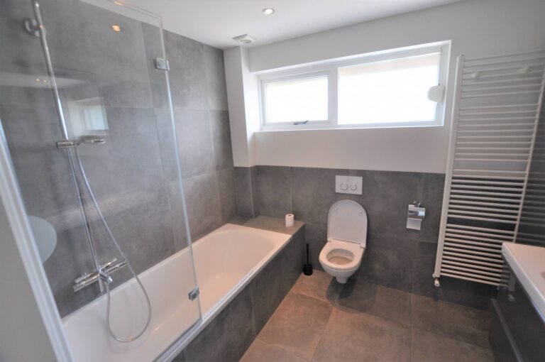 Op de eerste etage bevinden zich drie volwaardige slaapkamers, allen netjes afgewerkt en goed in te delen. De moderne badkamer is voorzien van een bad/douchecombinatie, een wastafel met meubel, een tweede toilet en een designradiator.