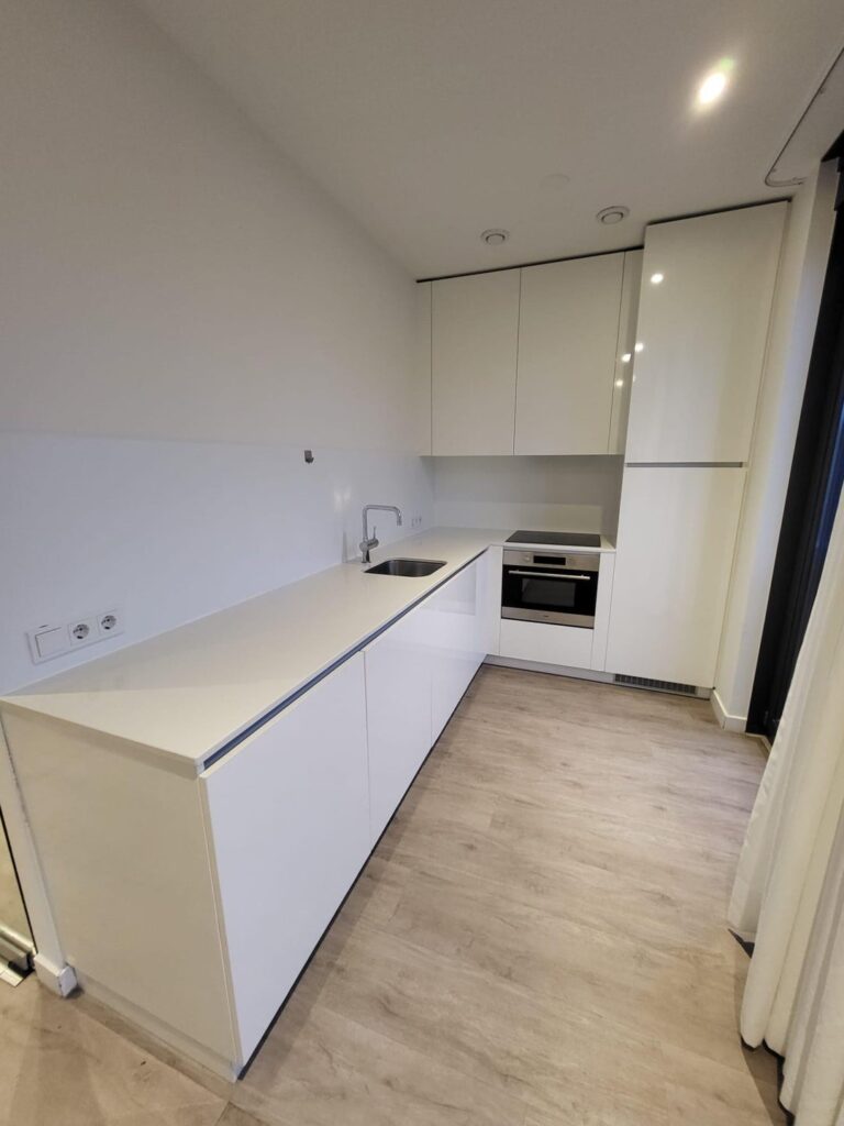 De luxe keuken (ca. 6 m²) is uitgerust met een koelkast, vaatwasser, spoelbak, combimagnetron, afzuigkap en een 4-pits keramische kookplaat. Het appartement beschikt over één slaapkamer (ca. 13 m²) en een balkon (ca. 7 m²).