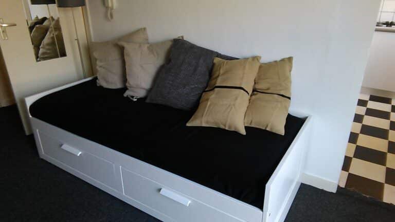 Ruime woon-/slaapkamer (17mยฒ) v.v. vloerbedekking met openslaande deuren naar het ruime balkon (13mยฒ). In de tweede ruimte (10mยฒ) de badkamer en de keuken. De keuken is v.v. 4-pits gaskookcomfort, afzuigkap, koelkast en andere keukenbenodigdheden. Tevens bevindt zich in de keuken een wasmachine.