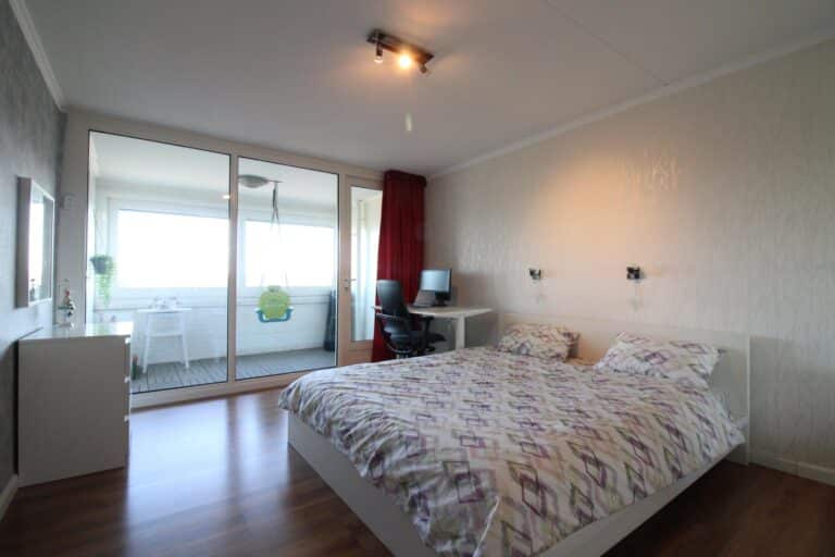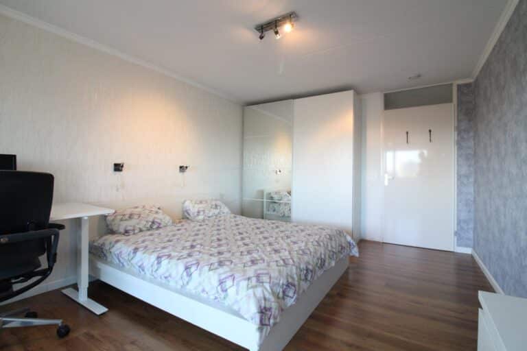 De ouderslaapkamer is aan de oostelijke zijde van de woning gesitueerd, en biedt ruim afdoende oppervlak voor een tweepersoonsbed, kledingkast en bureau, zoals zichtbaar op de foto's.