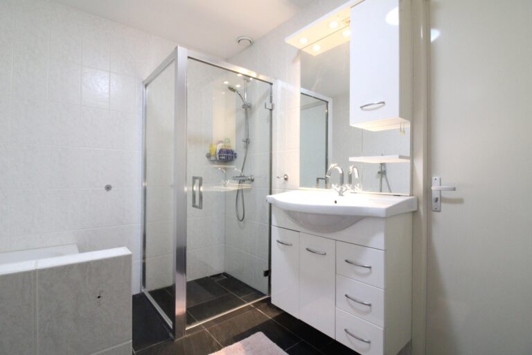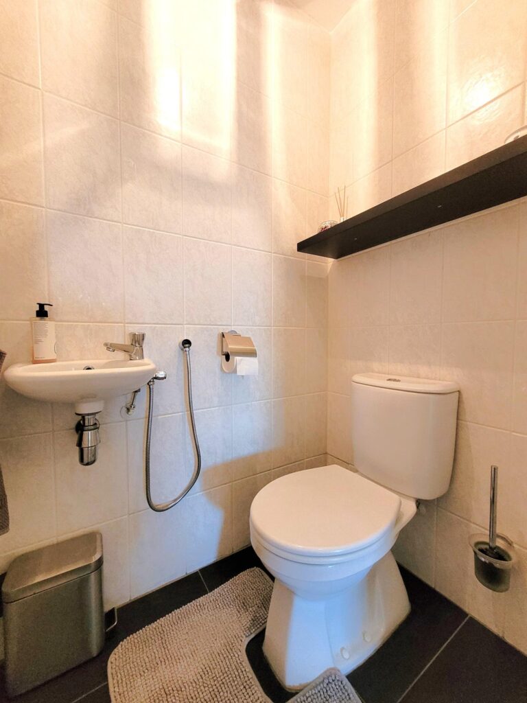 De volledig betegelde badkamer is goed van formaat, en heeft zowel een ligbad als een douchecabine, en daarbij een wastafel met ombouw. Een (gasten)toilet is separaat vanuit de hal te bereiken.