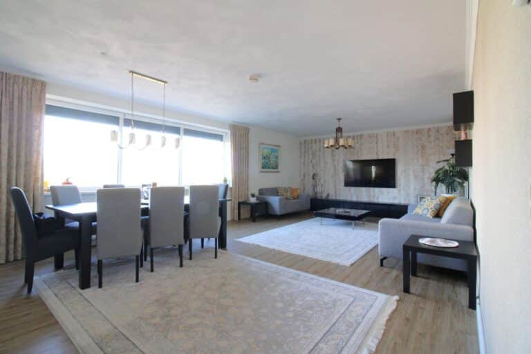 De royale woonkamer is uitgerust met een mooie PVC vloer, raamdecoratie en verlichting. Ook zullen er hier en daar kleine details aanwezig blijven die het gebruik makkelijker maken.