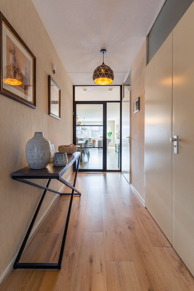 Royale hal met laminaatvloer (ook in slaapkamers). De hal geeft toegang tot de slaapkamers, badkamer, wasruimte, toiletruimte en de woonkamer.