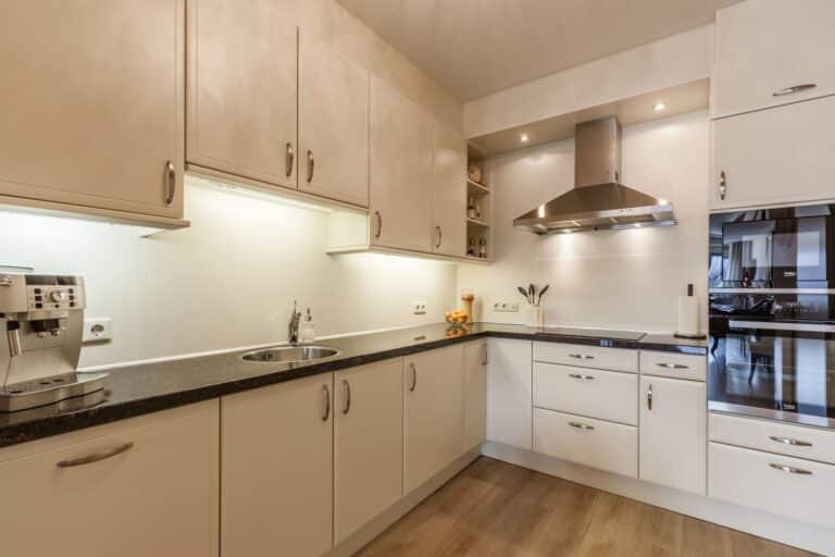 Open keuken voorzien van luxe inrichting, bestaande uit hoekopgesteld aanrechtblad (natuursteen) met onder- en bovenkasten en de volgende inbouwapparatuur: inductiekookplaat, afzuigkap, magnetron, oven, koelkast, vaatwasser en vriezer.