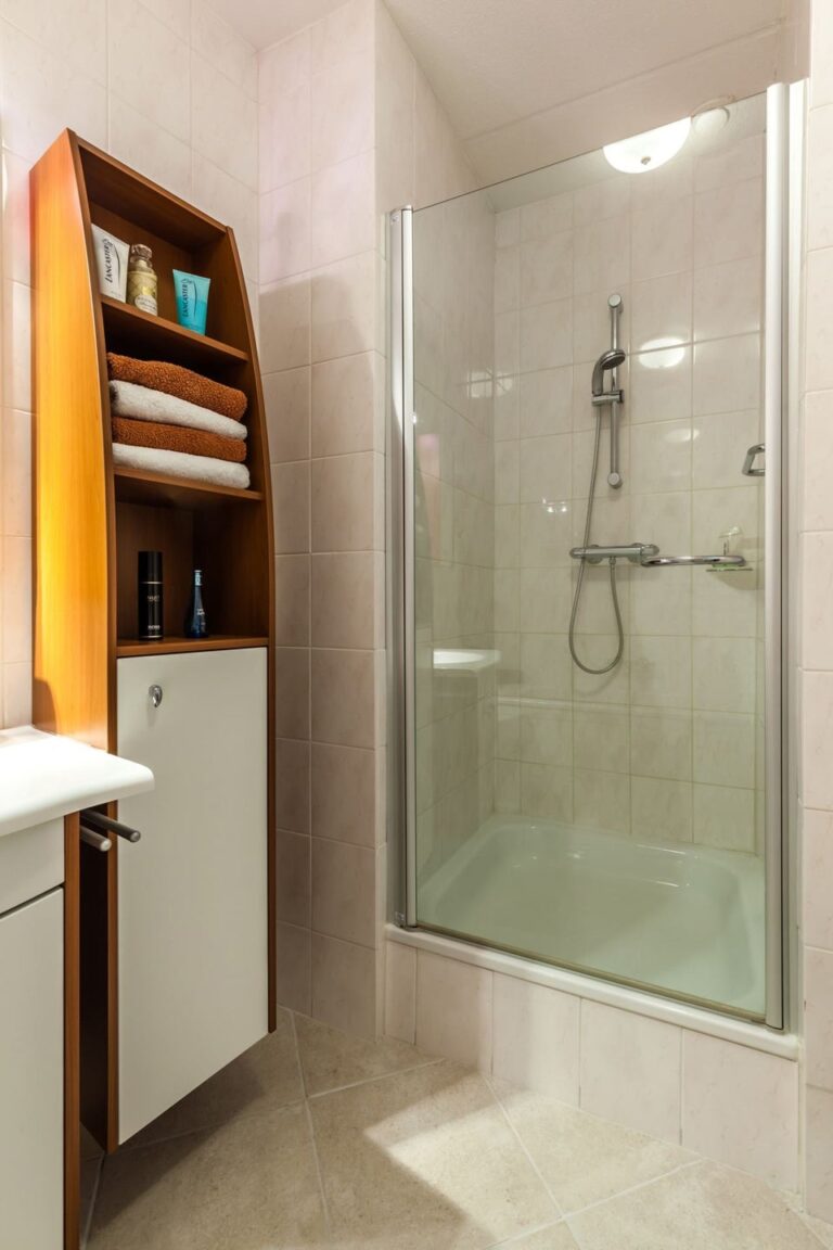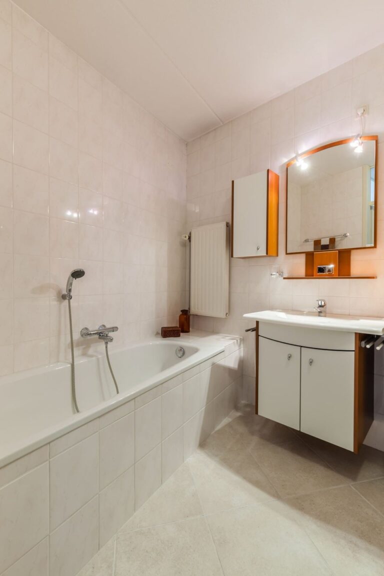 Compleet betegelde badkamer voorzien van ligbad met thermostaatkraan, douchecabine met thermostaatkraan en wastafel met badmeubel.