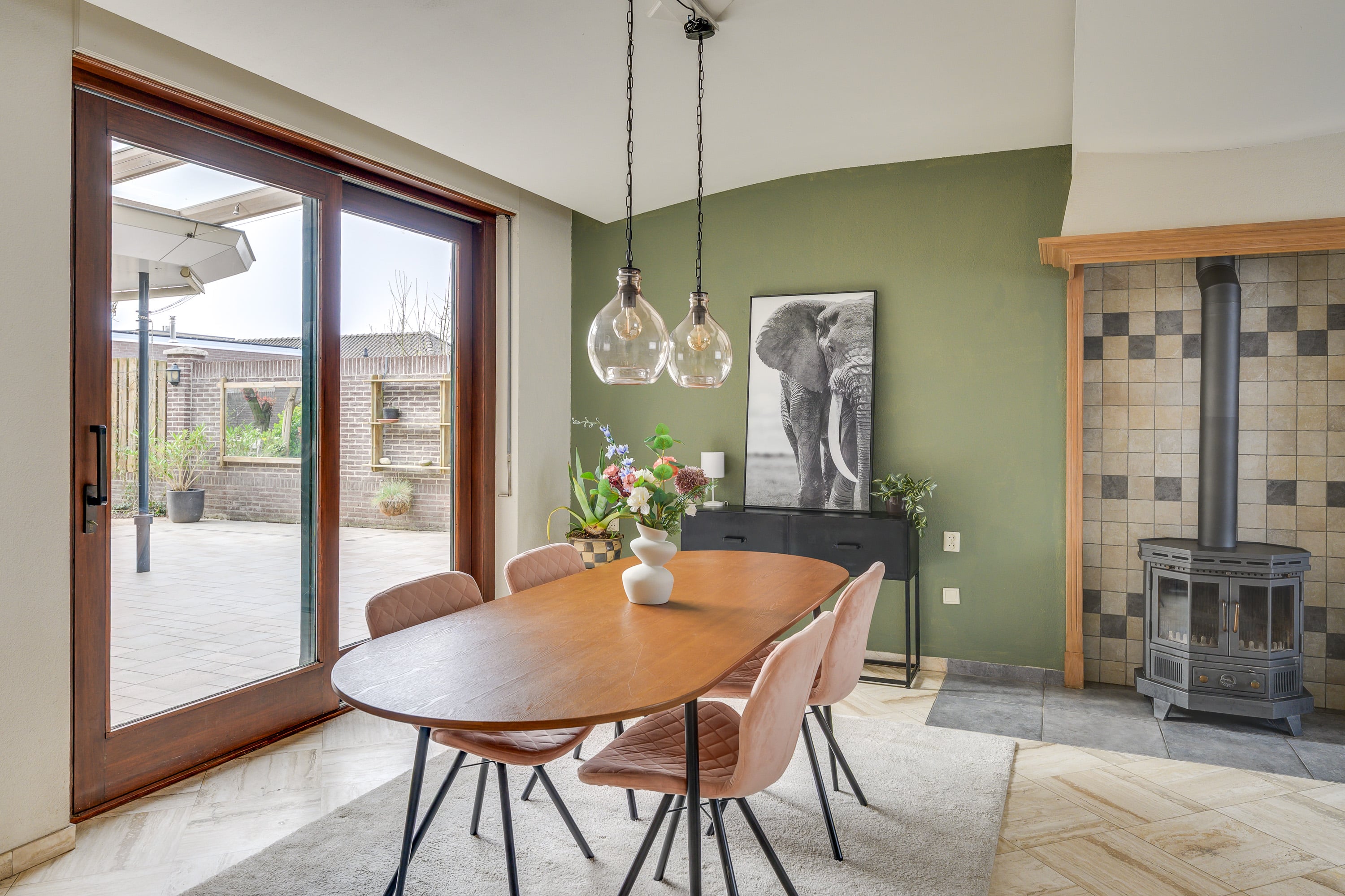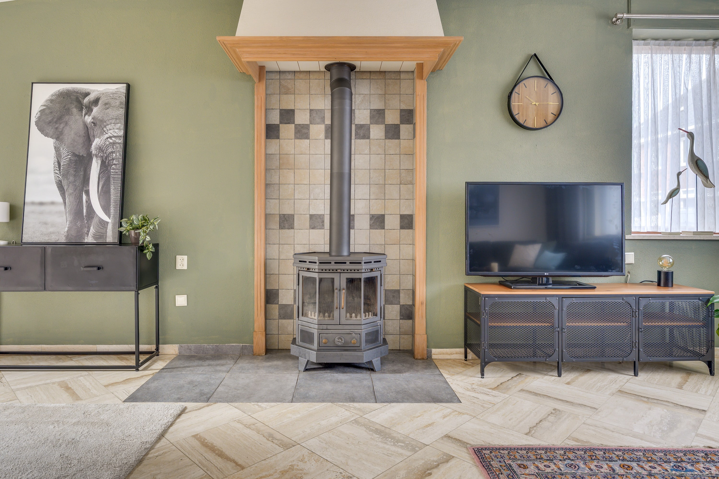 De woonkamer heeft een speelse L-vorm en een warme, karaktervolle uitstraling. De gebogen plafonds en subtiele koofverlichting geven de ruimte een uniek accent. De houtkachel maakt het geheel extra sfeervol. Dankzij de grote ramen aan voor-, zij- en achterzijde valt het daglicht rijkelijk naar binnen. De schuifpui aan de tuinzijde versterkt het gevoel van ruimte en verbindt wonen moeiteloos met buitenleven.