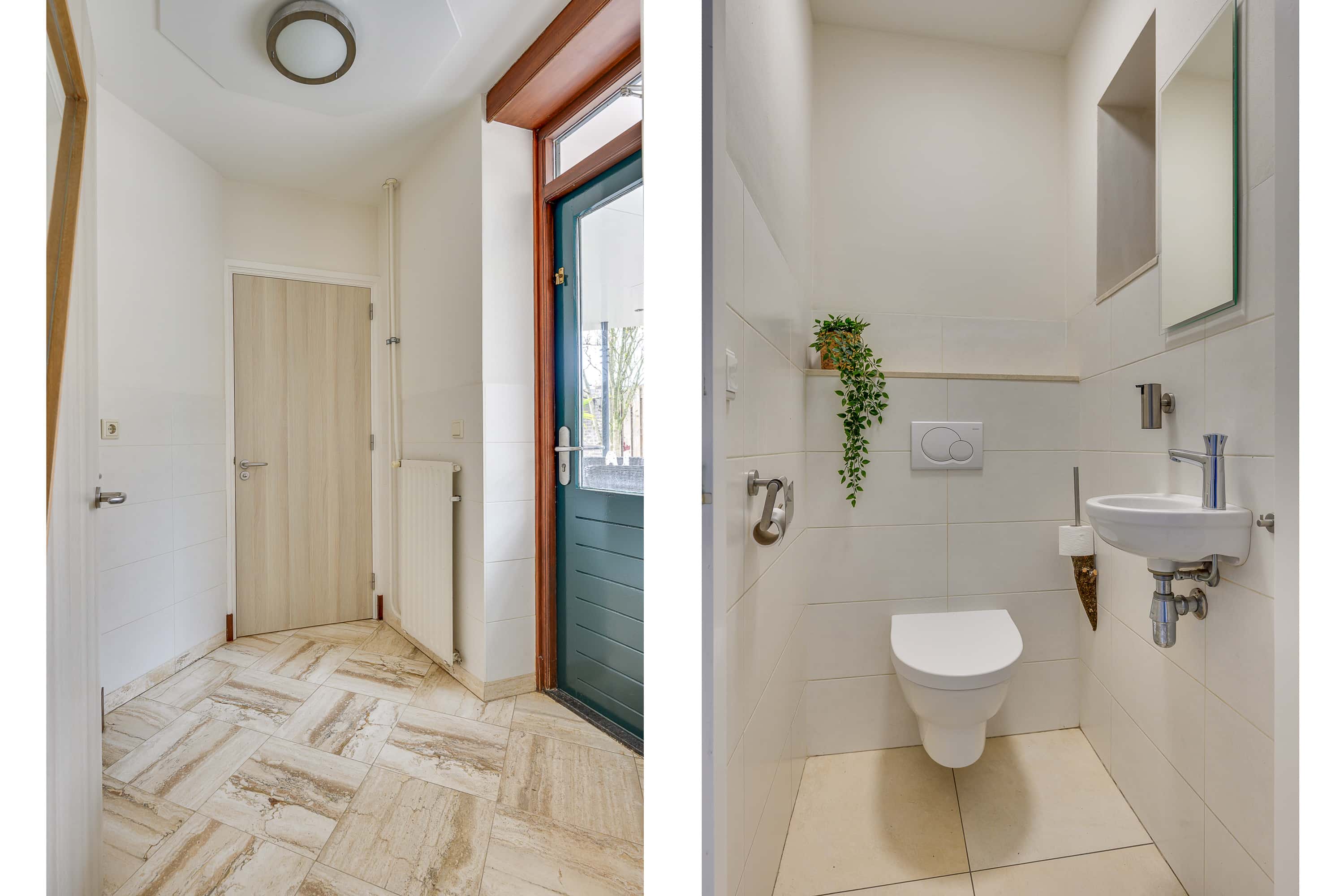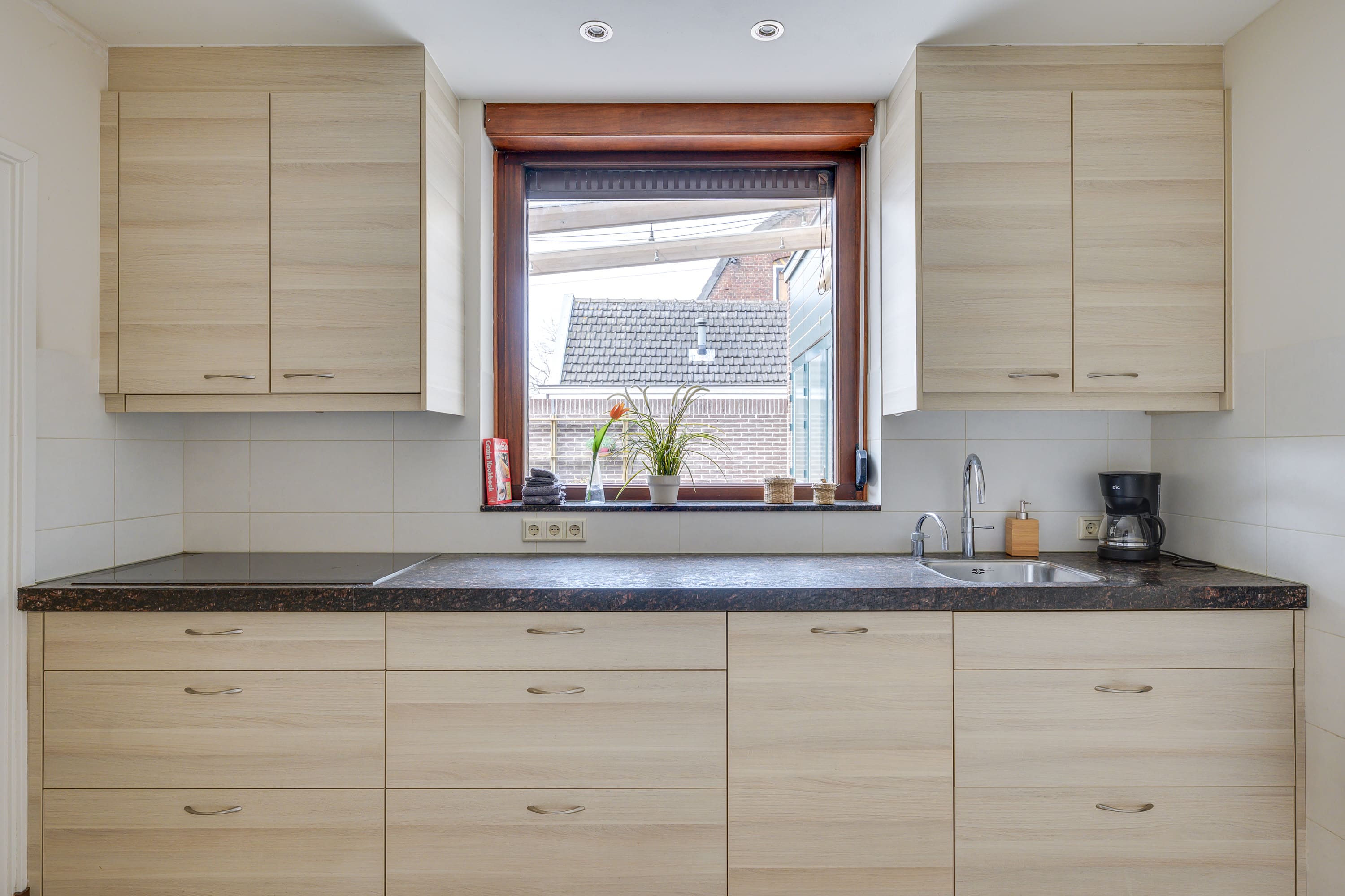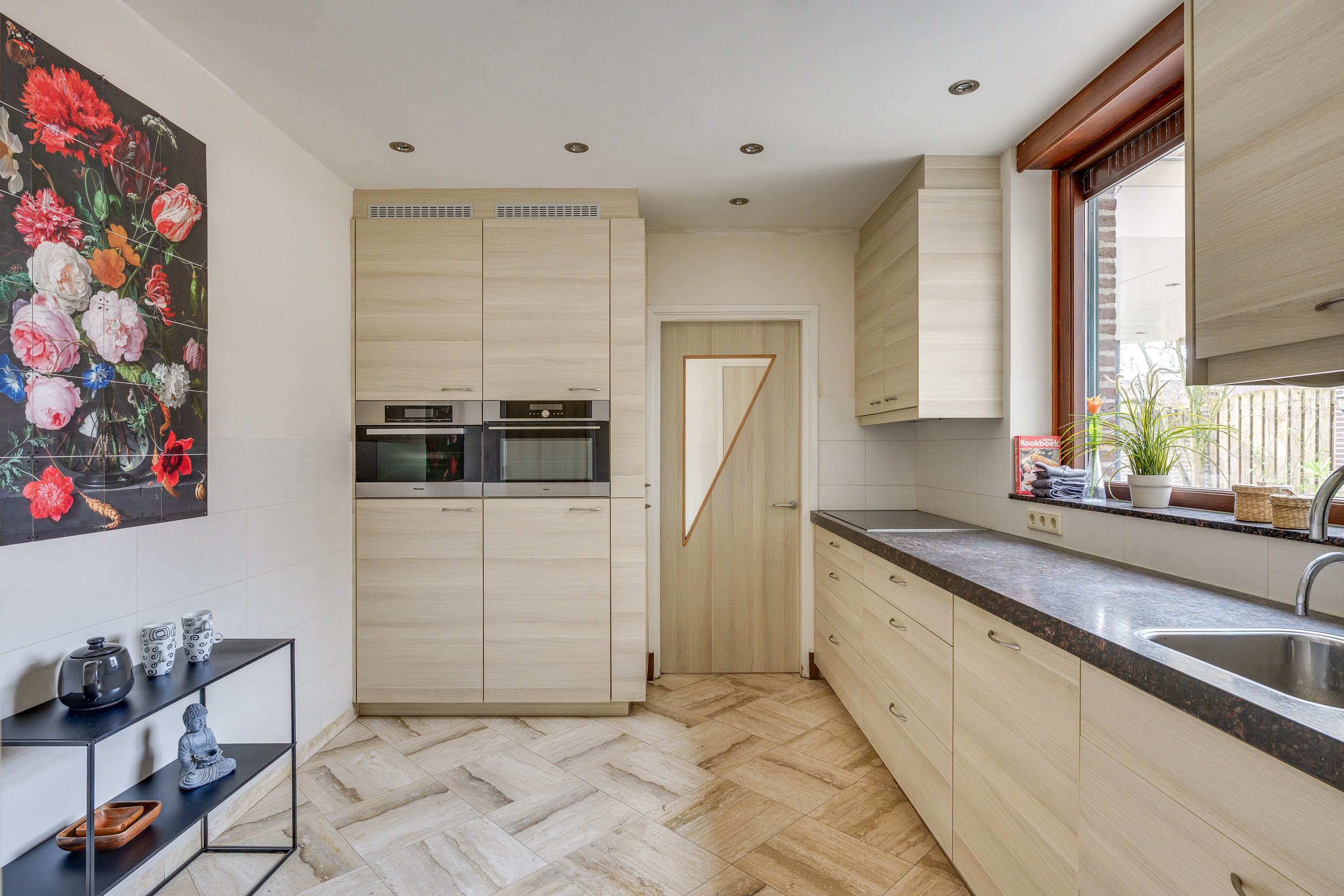 De keuken is in 2014 vernieuwd en vormt een stijlvolle leefruimte met een luxe uitstraling. Het massieve granieten werkblad springt direct in het oog en combineert prachtig met de houtlook kasten. Hier kook je met uitzicht op de tuin. De keuken is compleet uitgerust met een inductiekookplaat met afzuigkap, stoomoven, combi oven-magnetron en twee koelkasten. De vaatwasser en Quooker zijn in 2021 vernieuwd. De ruime, verdiepte trappenkast is volledig betegeld en biedt verrassend veel opbergruimte. Aansluitend ligt de achterhal met toegang tot de tuin en een volledig betegelde bijkeuken met gootsteen en aansluitingen voor wasmachine en droger. Aansluitend vind je het moderne, vernieuwde toilet met een wandcloset, fonteintje en draairaam.