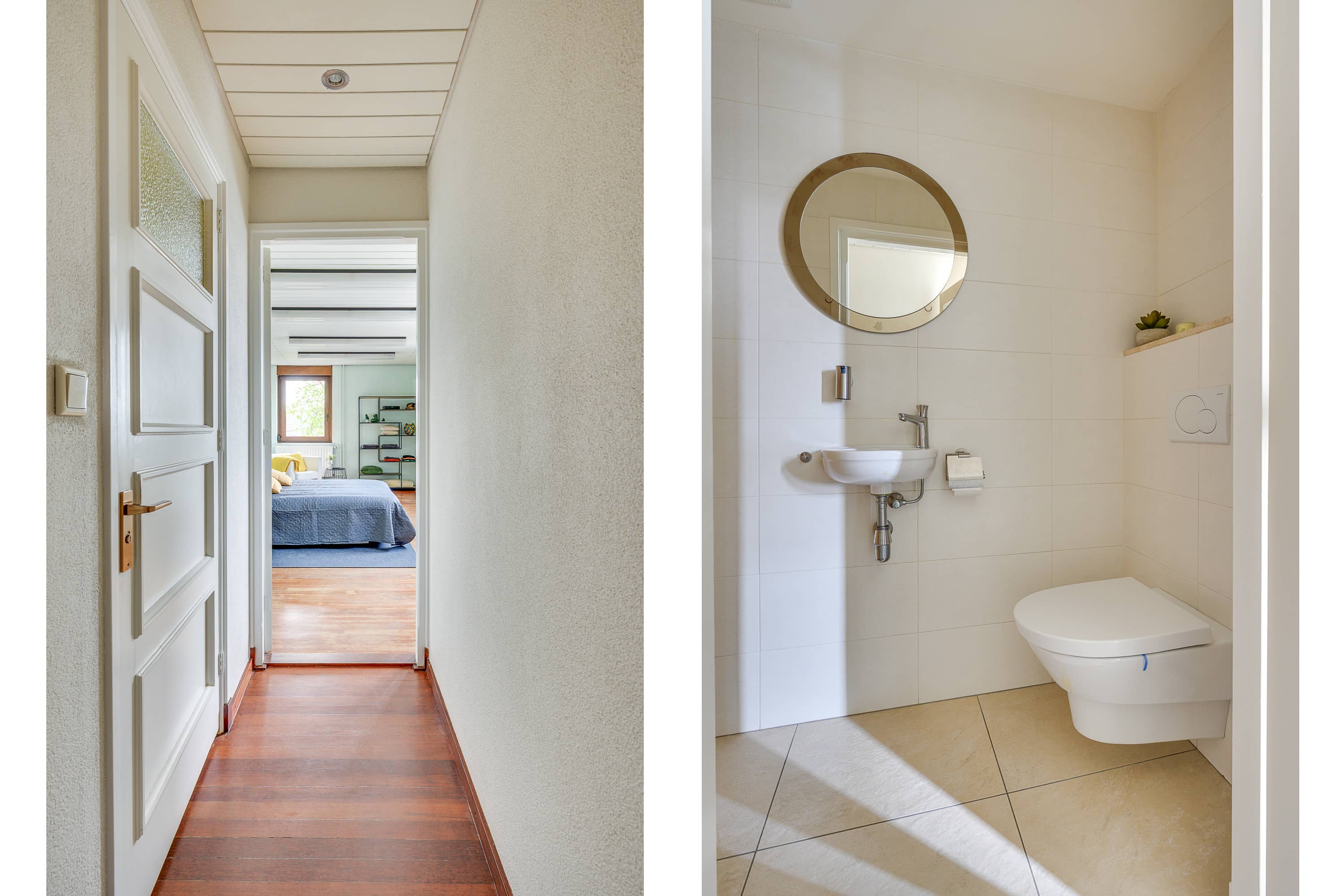 Op de eerste verdieping voelt het net zo comfortabel aan als beneden. De overloop met massief houten vloer heeft een warme uitstraling en geeft toegang tot drie slaapkamers, een separaat toilet en een moderne badkamer.