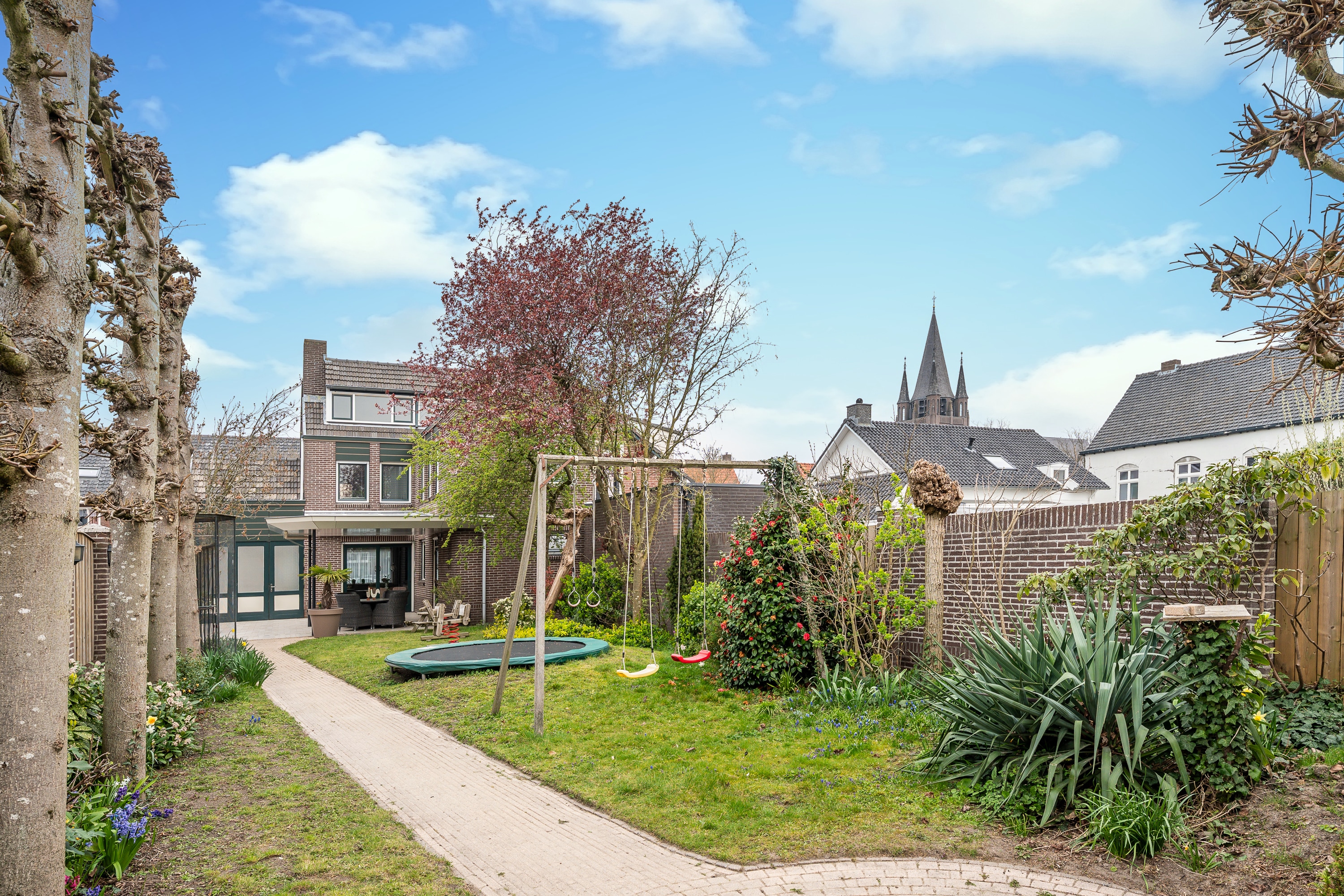 Een verzorgd pad leidt door het gazon en langs leilinden en volwassen beplanting naar het multifunctionele bijgebouw achter op het perceel. Ook daar is een gezellig terrasje aangelegd, zodat je meerdere plekken hebt om van zon of schaduw te genieten. De tuin biedt volop privacy en voelt als een natuurlijk verlengstuk van de woonruimte.